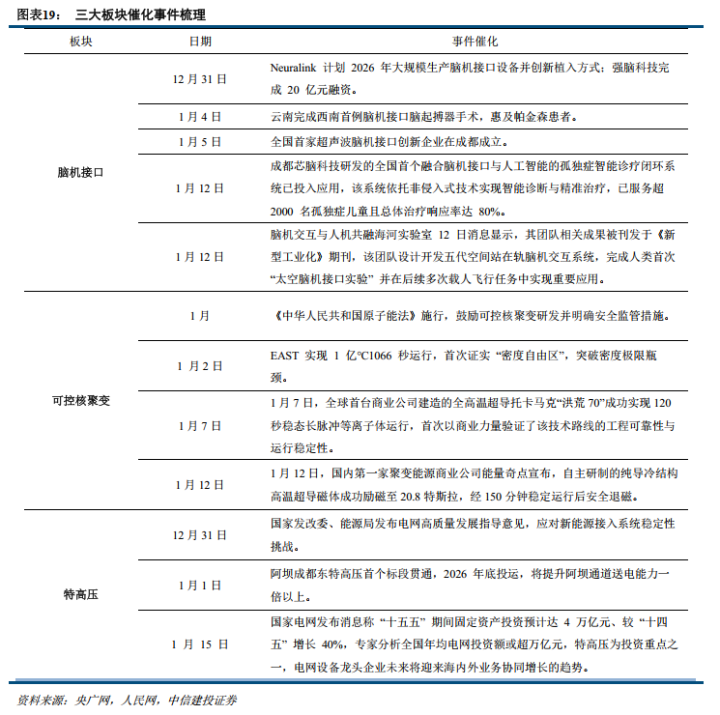 特高压、可控核聚变和脑机接口赛道值得关注。特高压赛道迎来明确政策红利,“十五五”期间总投资预计达5000-6000亿元,较“十四五”提升40%。前沿领域中,可控核聚变技术实现重大突破;脑机接口临床应用加速落地,叠加政策重点扶持,两大赛道成长空间广阔,值得长期跟踪。