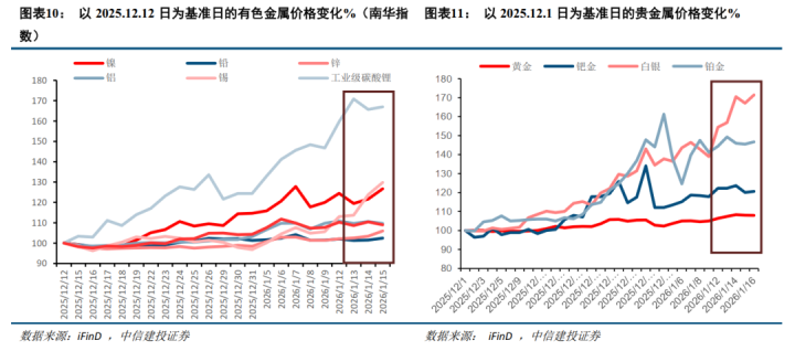 工业金属及有色金属板块上周整体价格中枢抬升,但短期波动明显加大。前半周在供给扰动预期、阶段性需求改善及情绪共振驱动下,碳酸锂、铜、镍、铝等品种价格快速上行,交易活跃度显著提升;但临近周末,锡与碳酸锂价格出现明显回调,主要反映前期涨幅较快后资金获利了结、以及现货成交与下游承接节奏偏谨慎,对短期价格形成压制。整体来看,有色及工业金属板块短期呈现出价格弹性放大、波动加剧的特征,需关注涨幅消化后的节奏变化。中长期维度下,工业金属仍受益于新能源、算力基建等结构性需求支撑,但短期更偏交易属性。